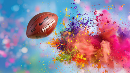 A stunning image of a football in mid-air surrounded by a vibrant explosion of colorful powders, creating an energetic and dynamic atmosphere.