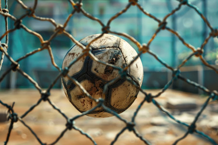 A dirty soccer ball is sitting on the ground next to a net. The ball is black and white, and it is worn and battered. Concept of wear and tear