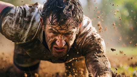 A soccer ball sits amidst mud, with water droplets suspended mid-air against a vibrant yellow backdrop. The image displays a close-up perspective, highlighting textures of the ball and surrounding debris. Suitable for commercial projects focusing on sports, outdoor activities, or concepts related to challenge and competition.