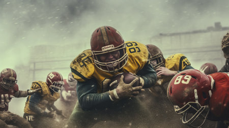 Close-up of focused American football player in helmet holding ball during night game. Intense athlete in action on stadium field with teammates blurred in background. Sports and competition concept.