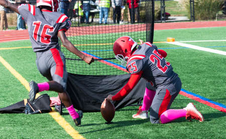 Rear view of a high school football field goal kicker on the sidelines during a game warming up kicking into a net with his holder.