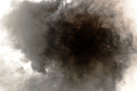 Burning black smoke on a white background. Close-up.