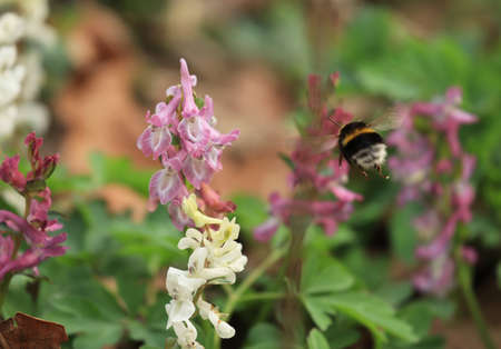 A bumblebee in the genus Bombus on the flowers of Corydalis cava