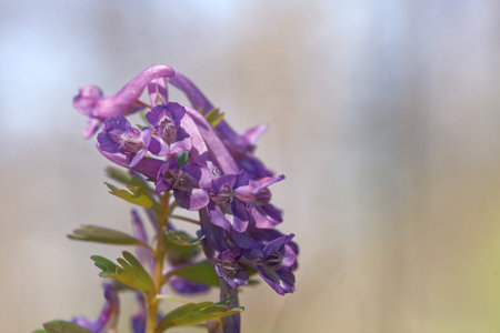 Purple flower Corydalis solida close-up on a blurred background. Shallow depth of field