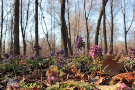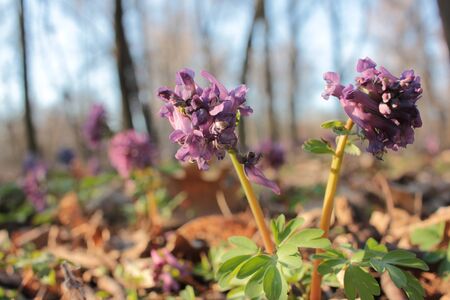First spring flowers purple bird (fumewort, corydalis solida) among the trees in the forest. Honey and medicinal plants in sunny day