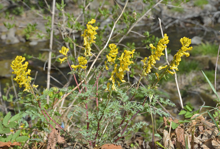 A close up of the yellow flowers birthwort (Corydalis). Early spring.