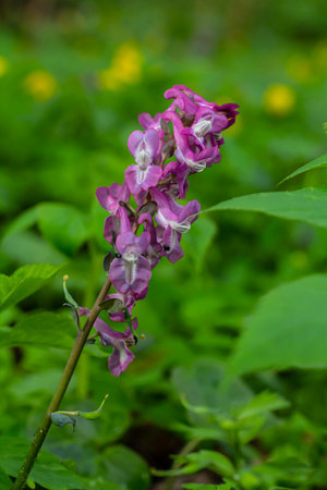 Spring landscape with beautiful corydalis solida purple bird, fumewort flowers in the forest. Honey and medicinal plants