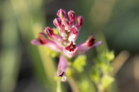 Beautiful Fumaria officinalis flower close up, illuminated by sunlight.Macro shot of flowers on a common fumitory (fumaria officinalis) plant