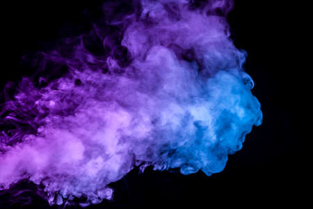 Clubs of colored smoke of blue and pink color on a black isolated background in the form of soft clouds from the vape