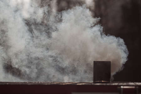 smoke coming from the chimney of the house in the winter, note shallow depth of field