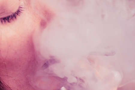 Close up portrait of the face of an adult serious man exhales blue toxic smoke while smoking e-cigarette and vape illuminated with pink colored light on a black background. Harm to health.