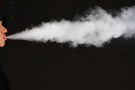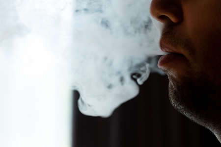 Vaping man. A cloud of vapor. dark blue background.