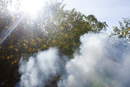 Bush of wild sunflower bloom in yellow, colorful scene in smoke at Da Lat, Vietnam
