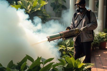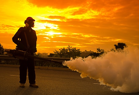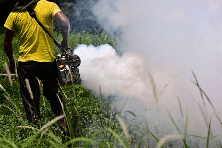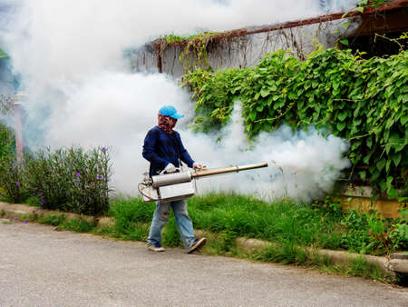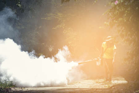 Health worker Fumigation fogging mosquitoes carriers of dengue Zika Virus or Malaria.