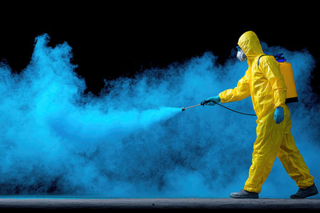 Worker spraying disinfectant in hazmat suit