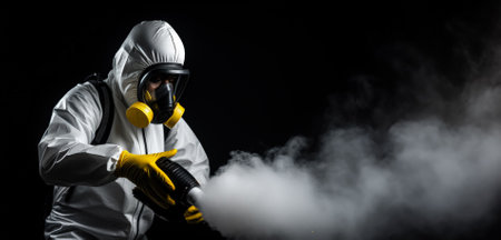 A disinfectant man against insects and bedbugs in a jumpsuit disinfects an apartment with a chemical substance and smoke. Wooden floor.