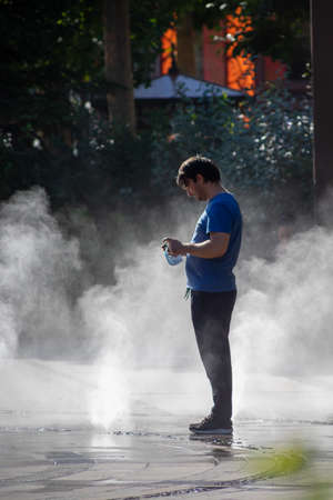 Timisoara, Romania - September 05, 2020: Man sitting in water vapor in a park