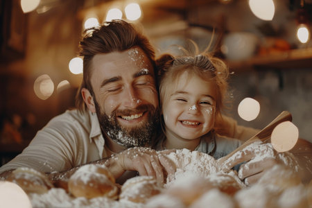 A dad and his daughter joyfully laugh together as they bake cookies in their cozy kitchen. Flour is dusted over their hands highlighting the fun and playful atmosphere of the moment.