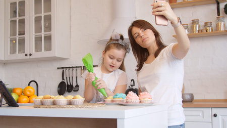 Mother and daughter icing cupcakes and having video call