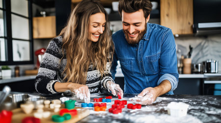 Young couple having fun in the kitchen making heart shaped cookies