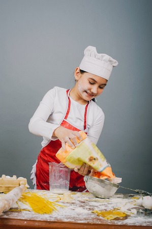 A little girl is playing in the kitchen, a chefs uniform.