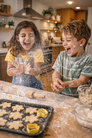 Two excited kids wearing chef hats playing with flour and dough in cozy kitchen childhood cooking fun and family activity image for education and advertising