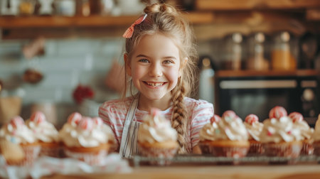 Beautiful girl 12 years old bakes holiday cupcakes in the kitchen.
