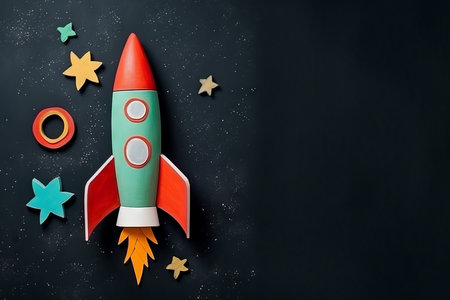 Rocket toy with confetti on a dark background. Space for text.
