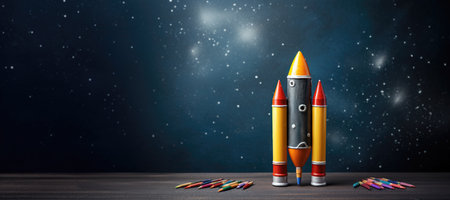 Colorful pencils and rocket on yellow background. Space for text