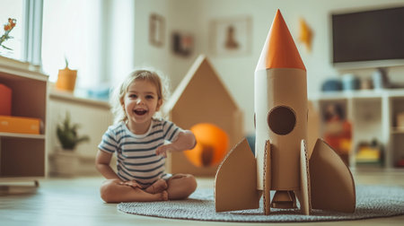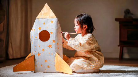 Dark-haired girl is painting a cardboard rocket ship in a cozy playroom, with soft textures and warm lighting, showing her creativity and imaginative spirit
