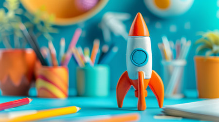 A vibrant toy rocket stands prominently on a blue table amidst colorful office supplies and a green plant, symbolizing creativity and inspiration in a modern workspace.