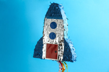 Bright pinata in shape of spaceship hanging on light blue background