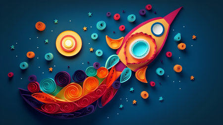 This vibrant image showcases a charming paper rocket launching from a cloud atop a table, surrounded by colorful elements depicting a playful space theme.