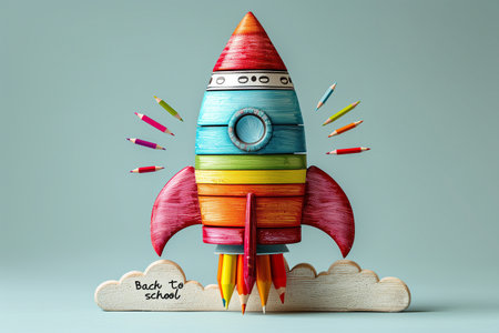 A playful rocket toy in vibrant colors stands proudly against a cheerful blue backdrop sparkling creativity.