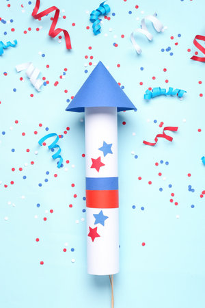 Firework rocket, confetti and serpentine for Independence Day on blue background
