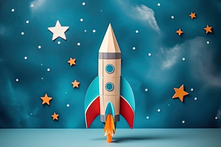 This image features a vibrant blue paper rocket atop a bright yellow background, embodying concepts of creativity, imagination, and playful innovation.