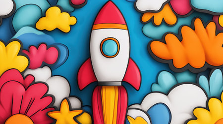 A cartoon rocket ship is surrounded by colorful clouds and flowers, AI