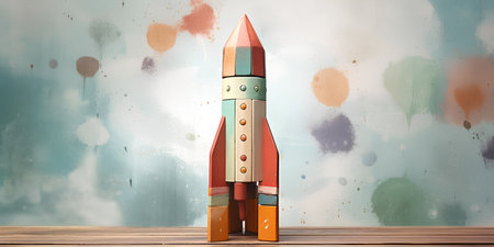 Wooden toy rocket ship on blue background, vibrant colors. Childrens imagination and creativity concept