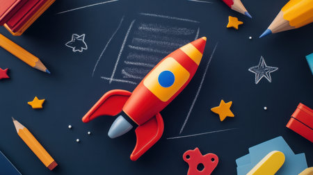 A vibrant scene featuring a colorful rocket toy surrounded by various art supplies and stars, illustrating creativity, playfulness, and learning for children. Perfect for educational themes.