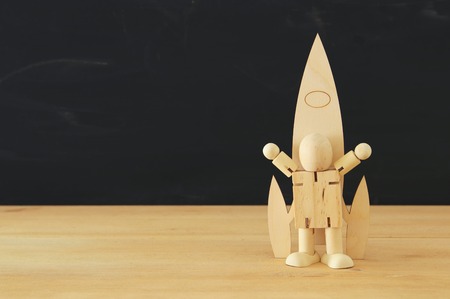 education or innovation concept. Wooden rocket over blackboard background. top view