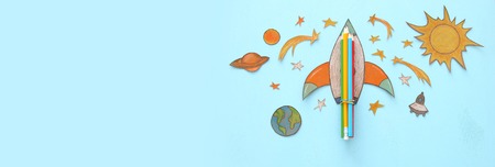 Back to school banner. rocket cut from paper and painted over wooden blue background