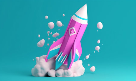 A rocket takes off on a blue background. Generative AI