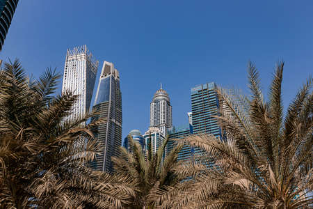 Dubai, UAE - November 06, 2021: Luxury Dubai Marina skyscrapers in United Arab Emirates