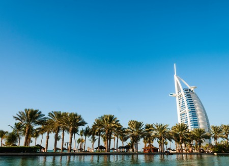 DUBAI, UNITED ARAB EMIRATES - DECEMBER, 10, 2013 Beach with palms and view on seven stars luxury hotel Burj Al Arab Tower of the Arabs in Dubai