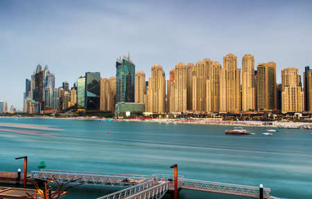 Dubai, UAE United Arabs Emirates - 29 May, 2019: Panoramic view of Dubai skyscrapers at the coast. Skyscrapers, modern architecture Dubai marina