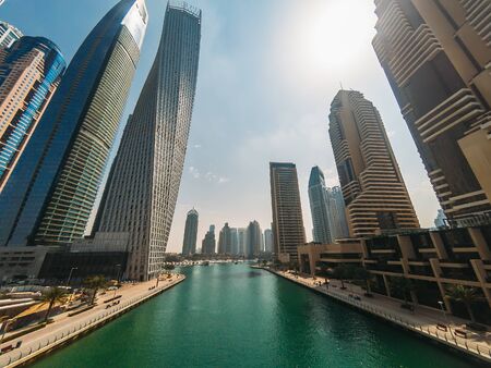 Dubai, United Arab Emirates - December, 2019: Dubai Marina canal and promenade in beautiful summer day
