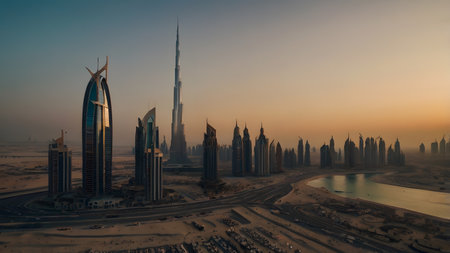 Aerial view of Dubai Downtown skyline, highway roads or street in United Arab Emirates or UAE. Financial district and business area in smart urban city. Skyscraper and high-rise buildings at sunset.
