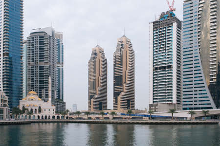 Dubai Marina canal in summer day with high buildings, UAE emirates.
