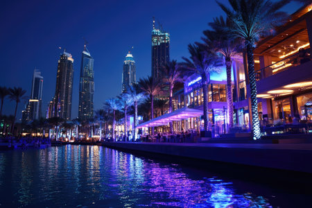 The illuminated Dubai Marina waterfront reflects the city lights, creating a colorful spectacle with palm trees and modern architecture