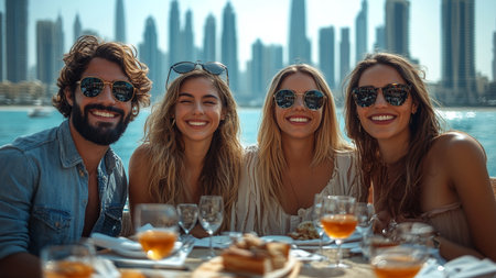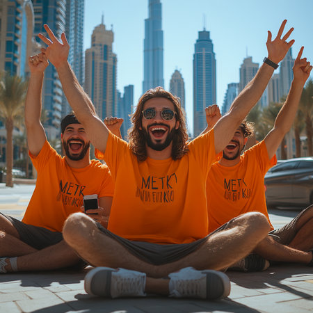 Happy girls walking in Dubai with skyscraper in the background.